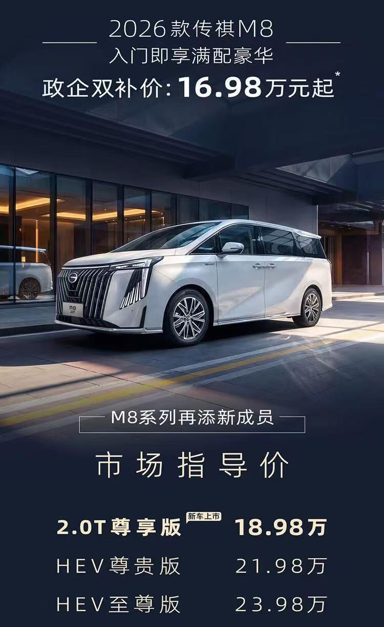 在国内中大型MPV市场中,传祺M8拥有不错的口碑和用户基础,是广汽传祺的代表作之一。现如今,传祺M8全系已构建起涵盖燃油、混动等多种动力形式的产品矩阵,潜在竞品包括别克GL8、大众威然等同级合资车型。而此次2026款传祺M8 2.0T尊享版的加入,进一步拉低了车系的购买门槛,这对于部分消费者而言或许是个好消息。