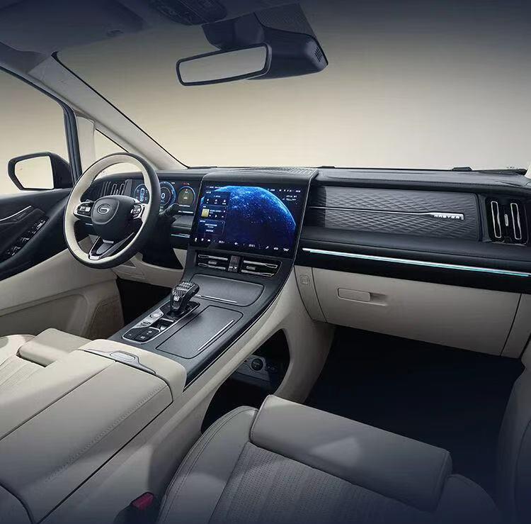 2026款传祺M8 2.0T尊享版仪表台的设计排布与在售HEV版本一脉相承,采用12.3英寸液晶仪表盘配搭14.6英寸中控屏,车机系统由高通骁龙8155芯片提供支持,具备四区语音、在线导航(GPS+北斗双模)等功能。